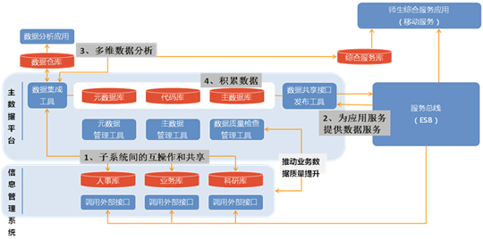 基于上述四個層面,高校在后期需要通過建立一個符合教育行業特性的高校數主據管理平臺。覆蓋高校數據層面全生命周期的管理。從信息標準、代碼標準,到數據共享、交換,直至最終的數據質量保證等。將高質量的主數據以服務的方式提供給校園服務總線,便于上層應用的抽取和使用。同時需要提升信息標準執行能力,采用自動化工具對校內信息標準和代碼標準進行監控和管理,讓標準真正成為標準、提升數據質量管理能力,保證數據價值的最大化、提升數據共享集成能力,做到數據實時共享。