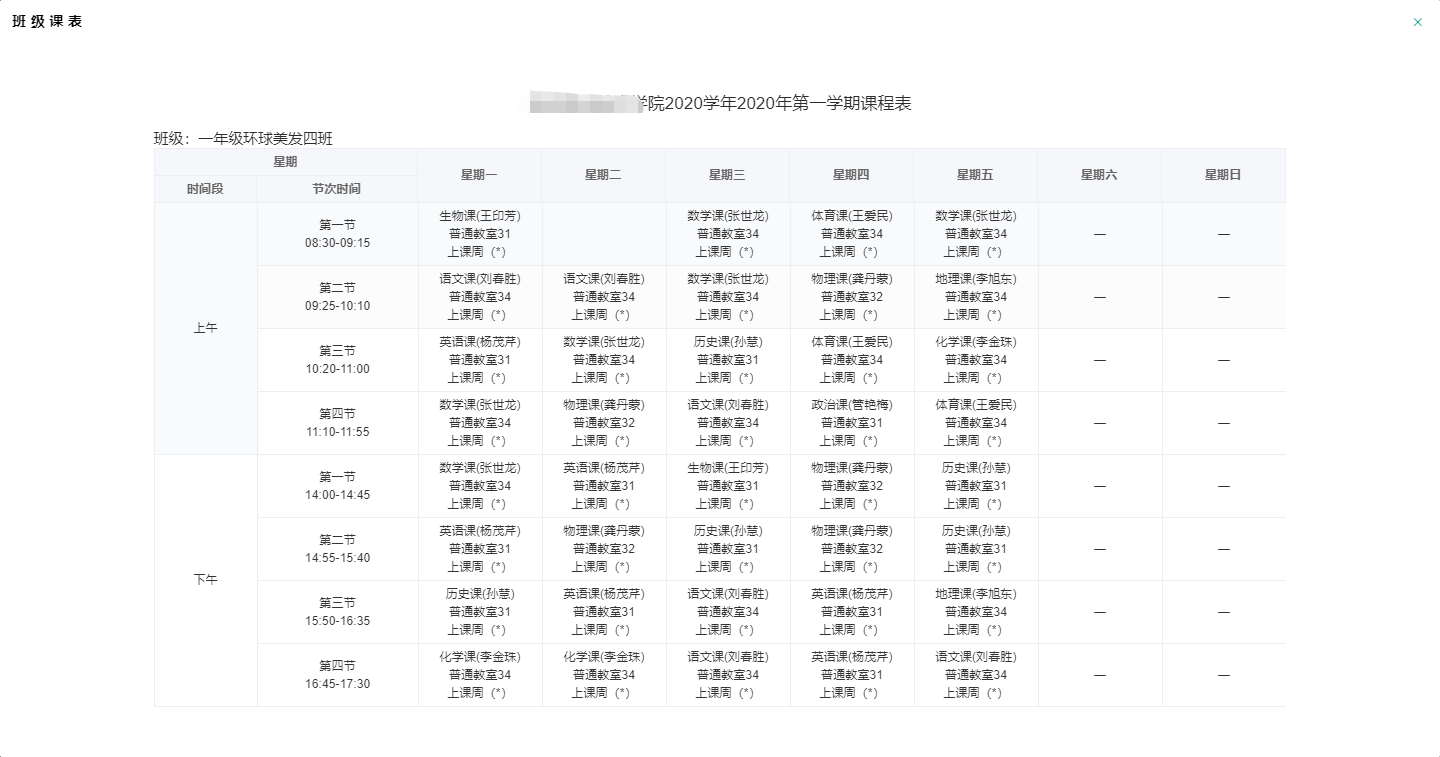 5.系統可以提供各類課表查詢瀏覽,如班級課表、教師課表、學生課表、教室課表,周課表、日課表、教師總課表、學生總課表、教室總課表等,學生課表能反映實習實踐環節教學內容。學院和各系的相關領導可以查看各系教師的課表。