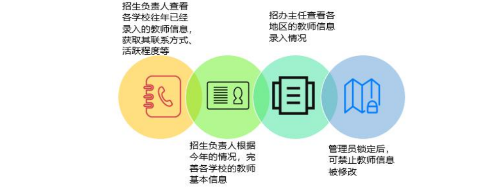招生負(fù)責(zé)人可查看各學(xué)校往年已經(jīng)錄入的教師信息,獲取其聯(lián)系方式方便錄取溝通,各招生負(fù)責(zé)人可根據(jù)今年的招生情況,完善個(gè)學(xué)校老師的信息,招生辦可查看各個(gè)地區(qū)錄入招生教師的詳情。