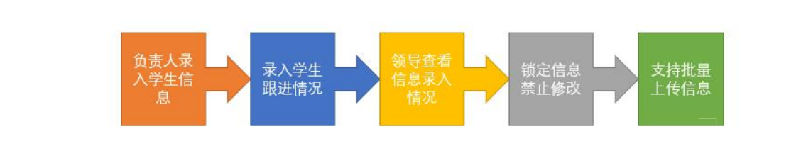 學(xué)生可在網(wǎng)上報(bào)名填寫個(gè)人信息,可由當(dāng)?shù)卣猩k老師登記學(xué)生信息進(jìn)入系統(tǒng);網(wǎng)上填報(bào)信息學(xué)生分配給各個(gè)招生老師跟進(jìn)。領(lǐng)導(dǎo)可查看信息錄入情況。