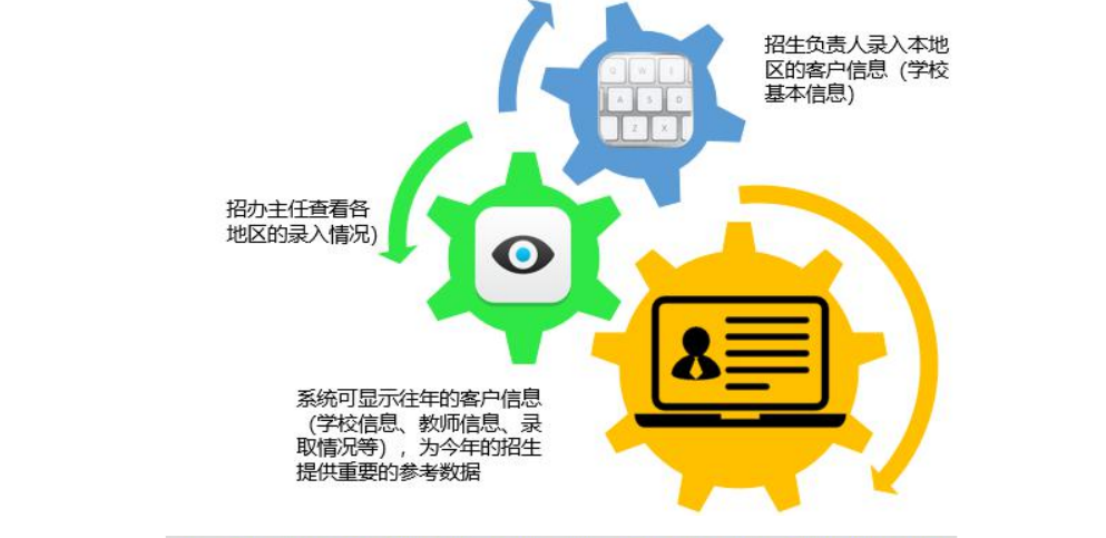 每個(gè)地區(qū)招生負(fù)責(zé)人錄入本地區(qū)的客戶信息已經(jīng)學(xué)校的基本信息,招生辦主任柯通過系統(tǒng)查看各地區(qū)招生錄入情況,系統(tǒng)可顯示往年客戶信息,招生信 息,錄取信息,為今年招生錄取提供參數(shù)。