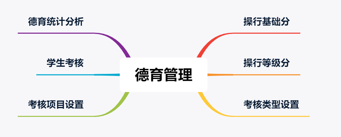 其中整個(gè)等于考核包含:操行基礎(chǔ)分、操行等級(jí)分、考核類型、考核項(xiàng)目、學(xué)生考核,德育統(tǒng)計(jì)分析。